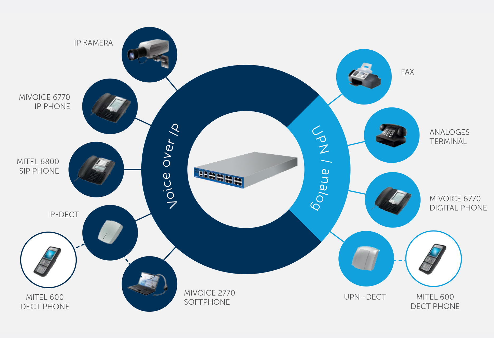 Wir verbauen flexible Kommunikationslösungen der Mitel 100 Serie. Zum Vergrößern auf Bildergalerie klicken.